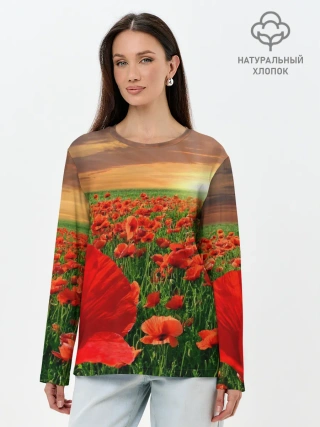 Лонгслив женский. Хлопок / Красный мак на закате