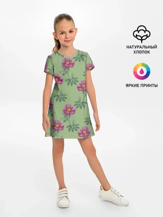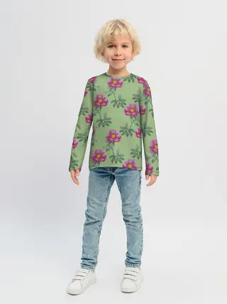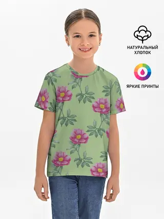 Детская базовая футболка / Пионы на светло зеленом фоне