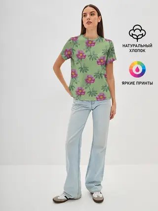 Женская базовая футболка / Пионы на светло зеленом фоне