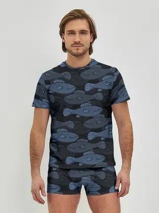Мужские трусы с футболкой / Синие рыбы на темном фоне