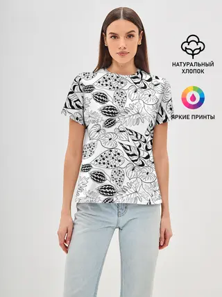 Женская футболка оверсайз / Черно-белый узор Тропики