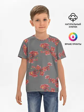Детская базовая футболка / Цветы айвы на сером фоне