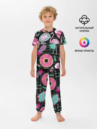 Детская пижама с брюками / Пончики, мопсы и фламинго.